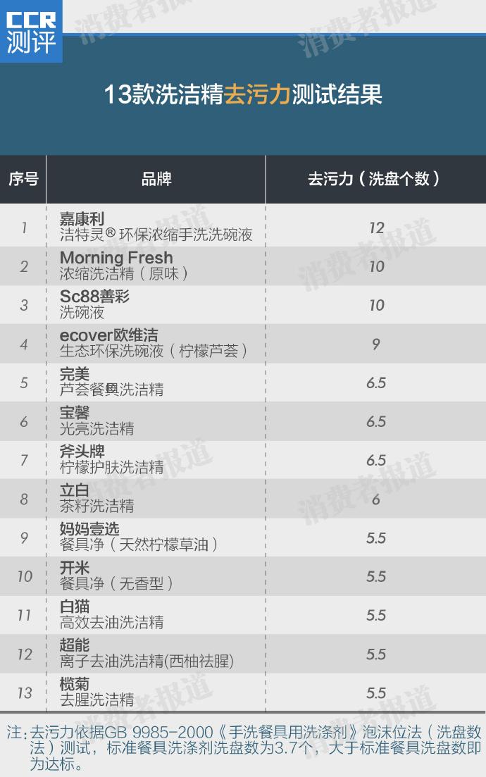 2018年11月,《消費者報道》向第三方威望檢測機構送檢了立白茶籽洗潔精、斧頭牌檸檬護膚洗潔精、媽媽壹選餐具凈、開米餐具凈、白貓高效去油洗潔精、超能離子去油洗潔精、欖菊去腥洗潔精、Morning Fresh稀釋洗潔精、ecover歐維潔生態環保洗碗液等9款市售知名洗潔精,以及完美蘆薈餐具洗潔精、寶馨光亮洗潔精、嘉康利潔特靈?環保稀釋手洗洗碗液、Sc88善彩洗碗液等4款直銷品牌洗潔精。測試目的包括甲醇、甲醛、防腐劑、二噁烷、熒光增白劑、洗潔精殘留等平安目的,以及去污力等功用目的。