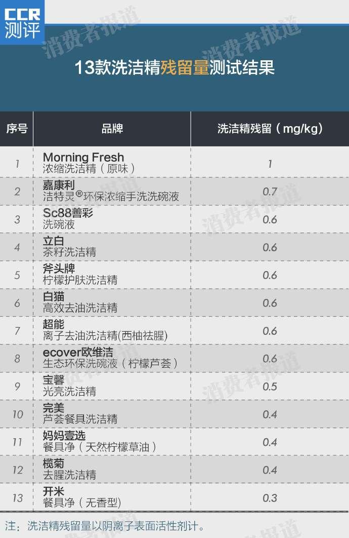 測試結果顯示,一切的13款洗潔精均有不定量的洗潔精殘留。其中, Morning Fresh的洗潔精殘留量相對較多,為1mg/kg。